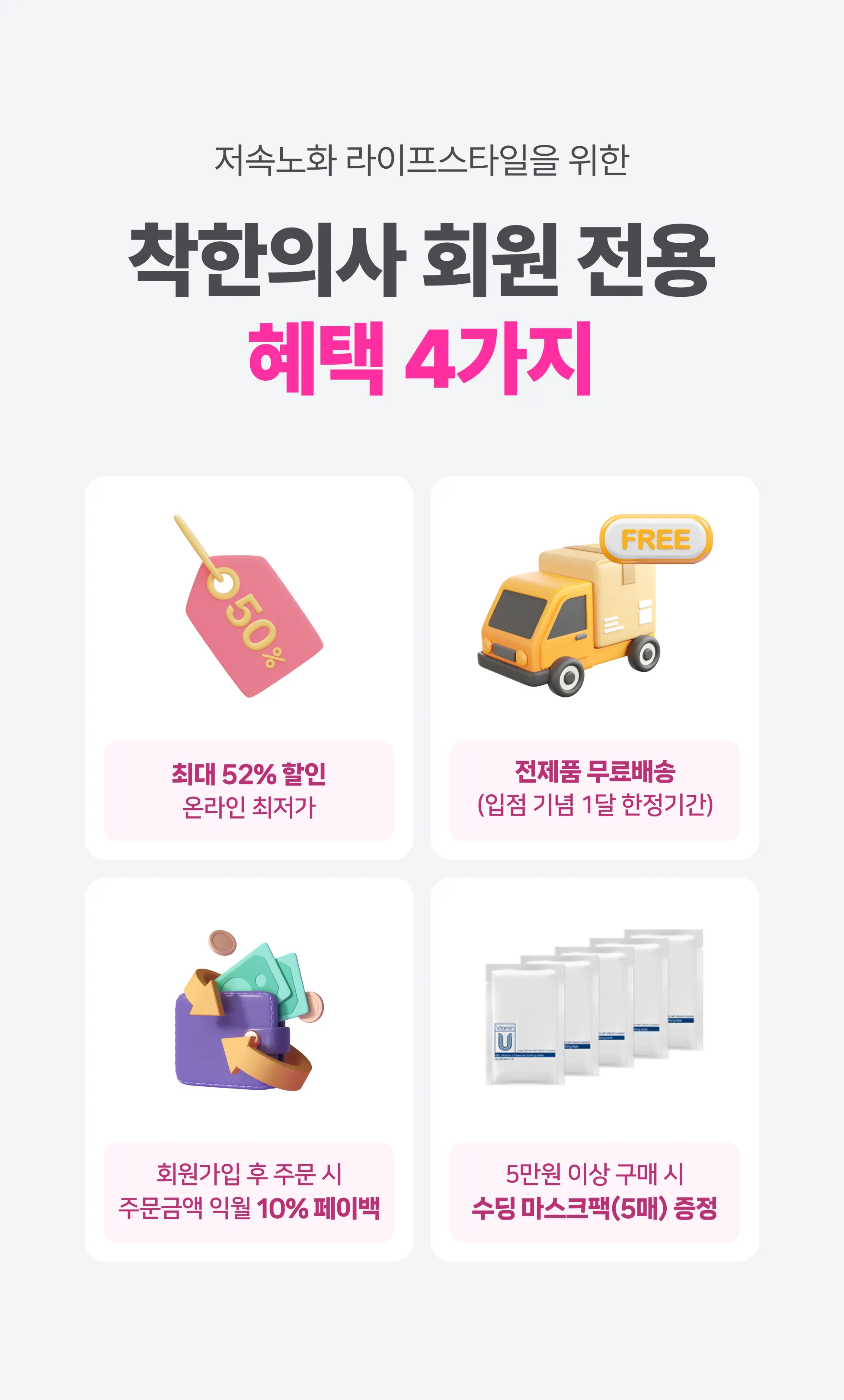 본 이벤트는 착한의사 전용 링크를 통해 접속한 전용 페이지 내 제품에 한해 적용됩니다.